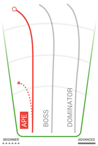The Ape can handle the raw, primal power of disc golfs biggest arms. Extremely fast and stable, the Ape is a "must have" distance driver for windy conditions and sharp doglegs. Sidearm drivers will learn the Ape is more than capable of standing up to even the most intense torque. The Ape is an outstanding choice for backhand or sidearm throws as well as a variety of niche flex shots. With less high speed turn than a Boss, the Ape is not recommended for players who throw less than 300ft.